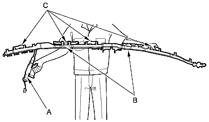 - The side curtain airbag module assembly is a long, jointed part containing an inflator (A), a flexible bag (B), and brackets (C). When removing or installing the side curtain airbag inflator assembly, never: