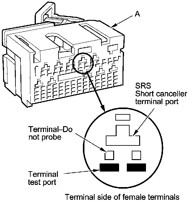 When diagnosing or troubleshooting at an SRS unit connector (A), use the terminal test port below the terminal you need to check. Gently insert the pin probes of the tester or jumper wire at the terminal test port from the terminal side.