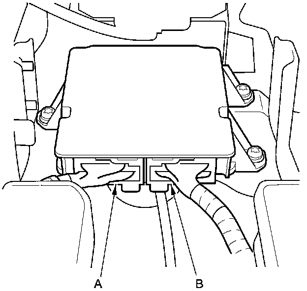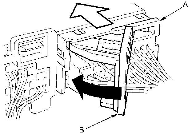 To reconnect the connector, push in on the connector (A). As the connector is pressed in, the lever (B) moves to the locked position.