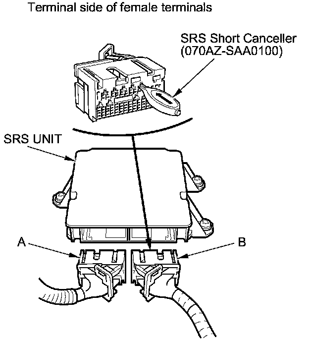 When SRS unit connector A (39P) or B (39P) is disconnected, a short circuit is automatically created in the connector to prevent accidental deployment of an airbag or tensioner. The circuit may need to be opened sometimes when diagnosing the system. Insert an SRS short canceller (070AZ- SAA0100) in the specified cavities when necessary to keep the circuit open for diagnosis.