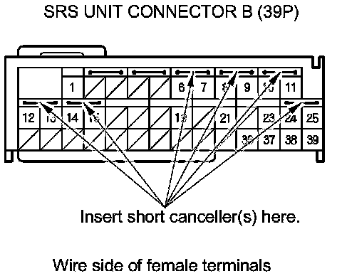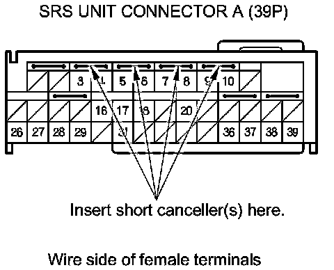 Terminal numbers are shown from the wire side of the female terminals. Insert the SRS short canceller(s) into the cavities on the terminal side of the connector.