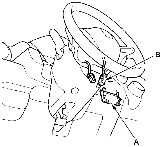 2. Remove the access panel (A) from the steering wheel, then disconnect the driver's airbag inflator 4P connector (B) on the cable reel harness.