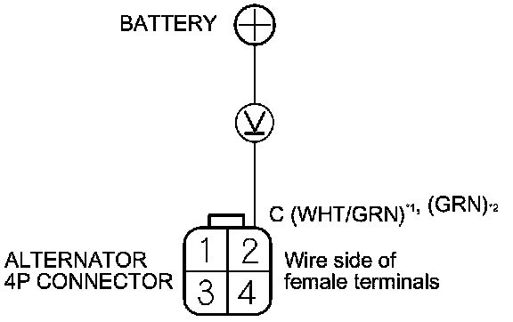 7. Measure the voltage between alternator 4P connector terminal No. 2 and the positive terminal of the battery.