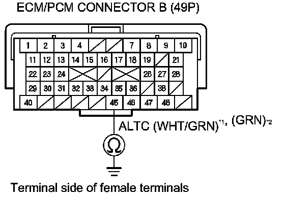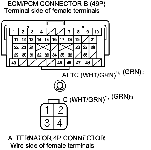 13. Check for loose terminals and connectors, then check for continuity between ECM/PCM connector terminal B45 and alternator 4P connector terminal No. 2.