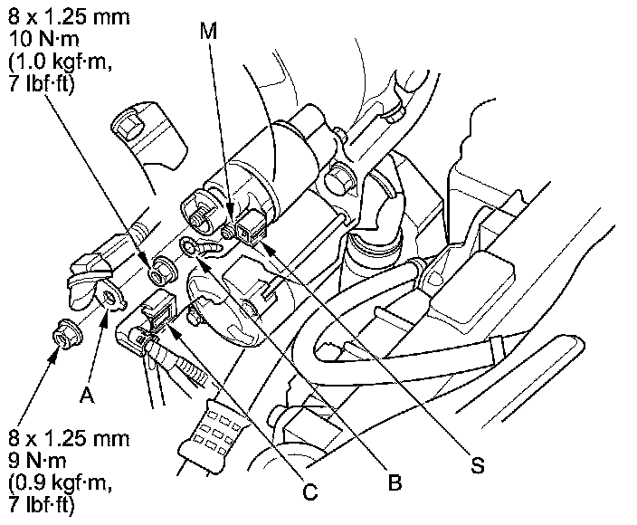 2. Disconnect the starter cable (A), the motor wire (B), and the S terminal connector (C).