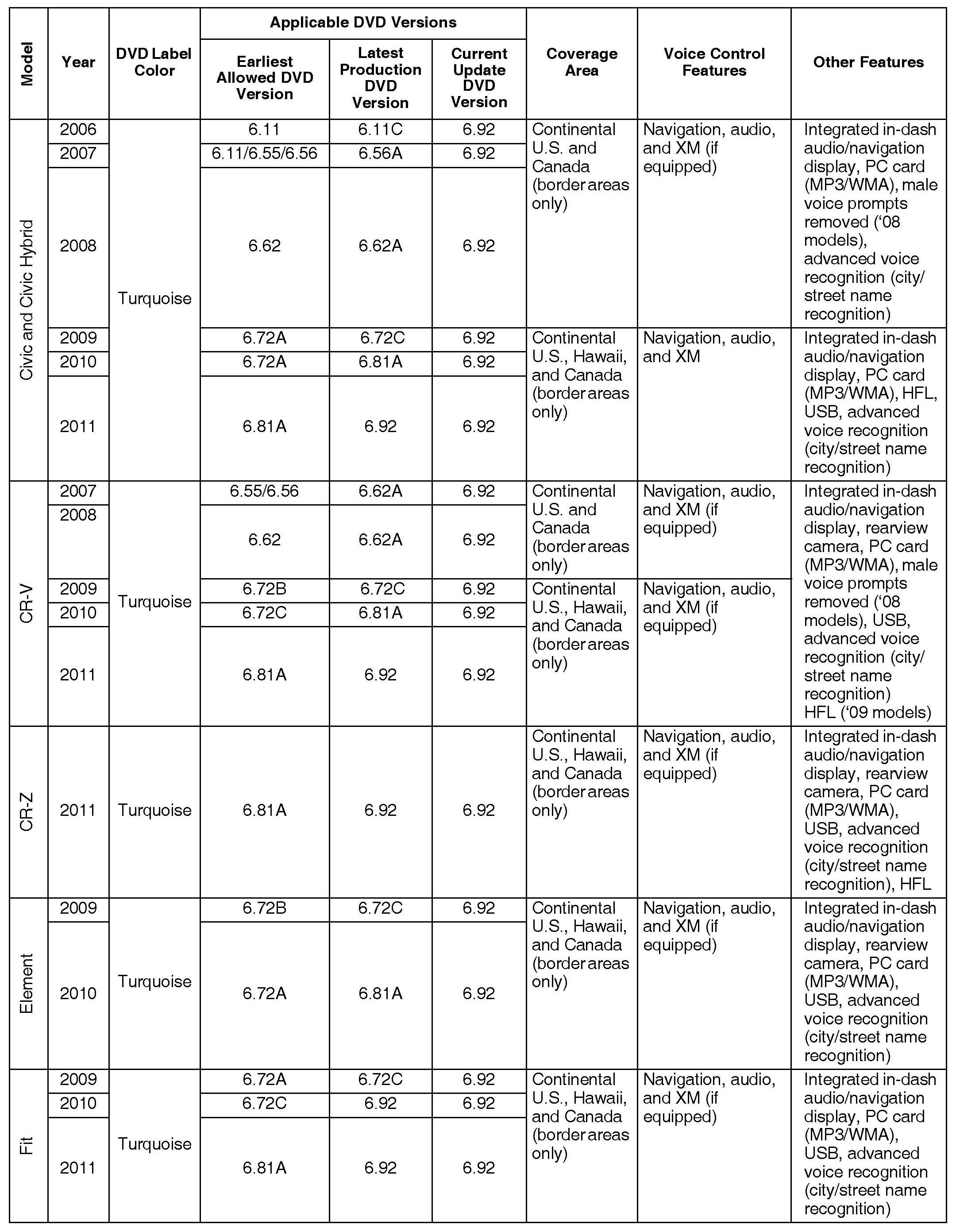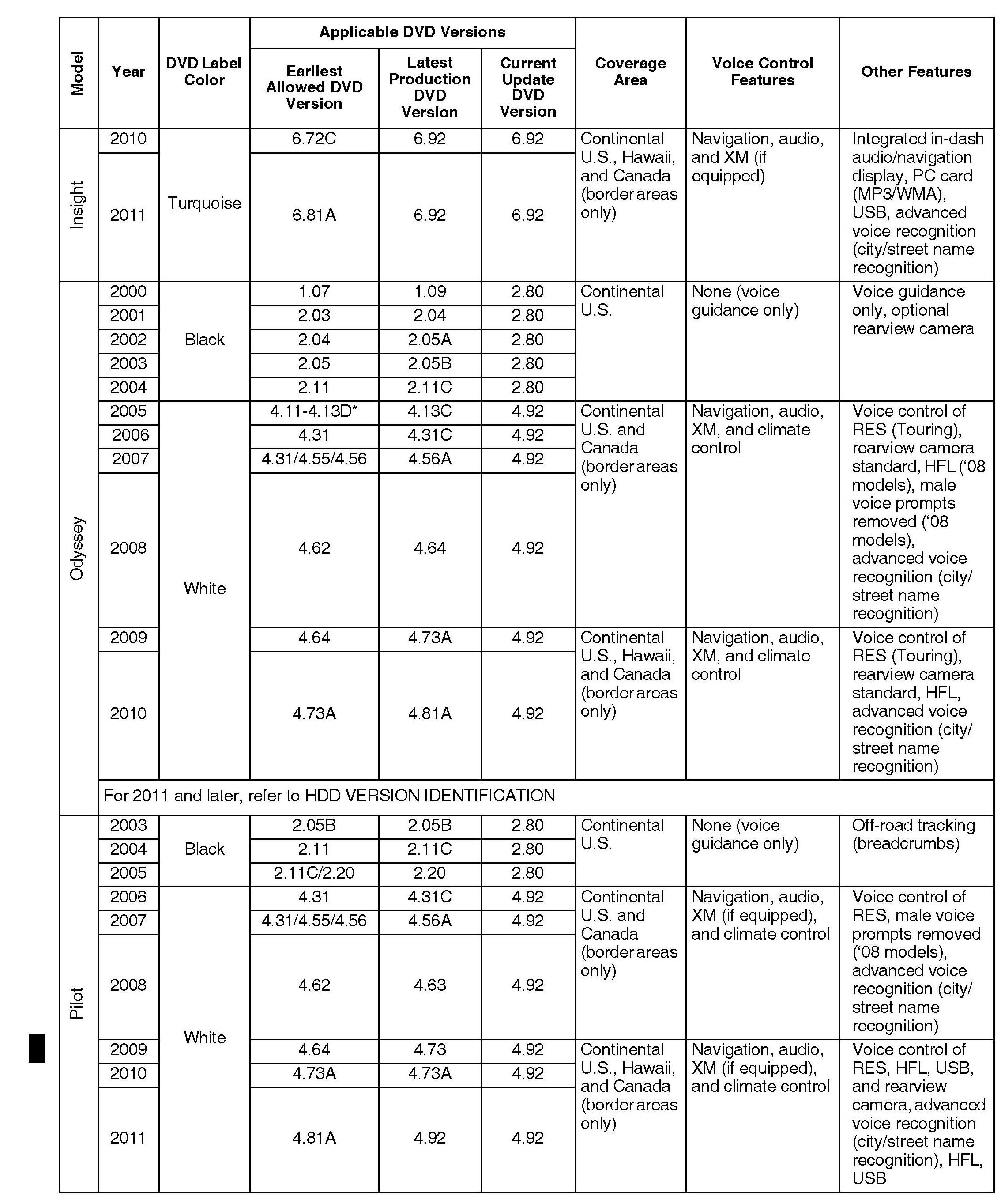 Each navigation system DVD contains a map/POI (point of interest) database and the navigation system software for each model that it supports. Inserting an older DVD (such as an earlier version than indicated in the table) can cause problems since it lacks the software to provide the specific features needed for that model. Unfortunately, the navigation software may not detect or warn you that the version is outdated, and it may even appear to operate normally.