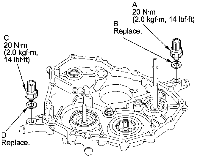 6. Install the new transmission fluid pressure switch B (3rd clutch) and a new sealing washer (D), and tighten the metal part of the switch.