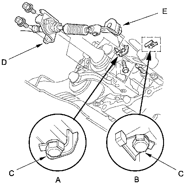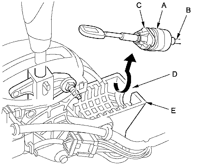 6. Rotate the socket holder (A) on the shift cable (B) a quarter turn; the corner (C) on the socket holder will be in the opening (D) of the shift lever bracket base (E). Then slide the holder to remove the shift cable from the bracket.