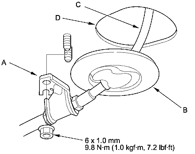 13. Insert the new shift cable through the grommet hole (D), and install the grommet in its hole. Do not bend the shift cable excessively.