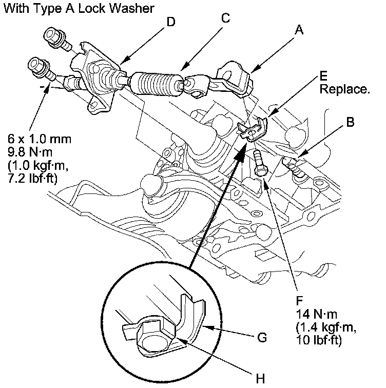 - With type A lock washer: Install the flange (G) of the lock washer facing the transmission housing as shown, then bend the lock tab (H) of the lock washer against the bolt head securely.