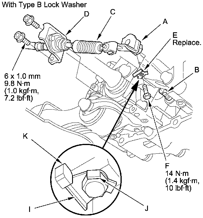 - With type B lock washer: Install the flange (I) of the lock washer facing the control lever as shown, then bend the lock tab (J) of the lock washer against the bolt head securely. Do not ride the lock washer on the stop (K) on the control lever.