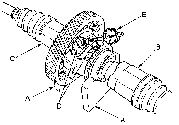 1. Place the differential assembly on V-blocks (A), and install the right driveshaft (B) and the left driveshaft (C).