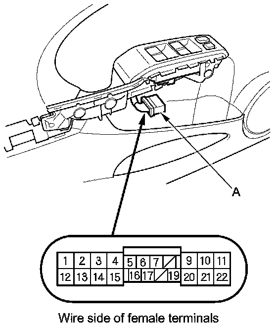 2. Test the motor in each direction by connecting battery power and ground to the power window master switch 22P connector (A) according to the table.