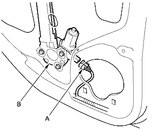 5. Disconnect the 2P connector (A) from the rear power window motor (B).
