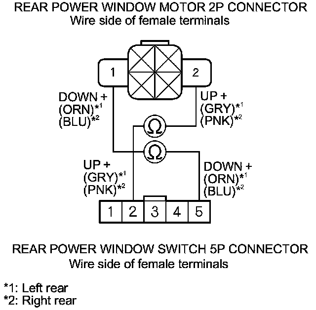 6. Check for continuity between rear power window switch 5P connector terminals No. 2 and No. 5 and rear power window motor 2P connector terminals No. 1 and No. 2 respectively. There should be continuity.