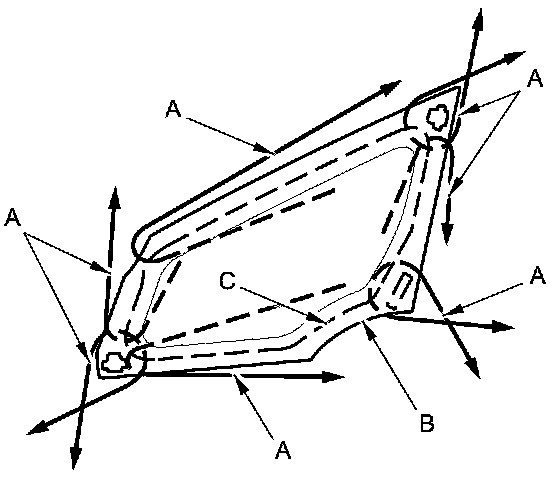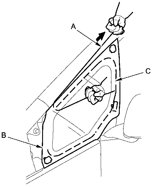 5. With a helper on the outside, pull the piano wire (A) back and forth in a sawing motion. Hold the piano wire as close to the front corner glass (B) as possible to prevent damage to the body, and carefully cut through the adhesive (C) around the entire front corner glass.