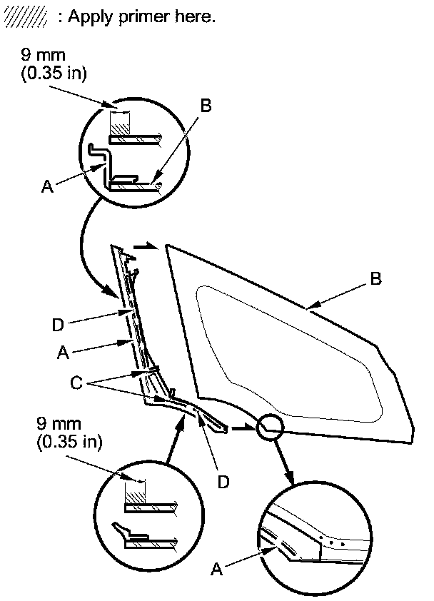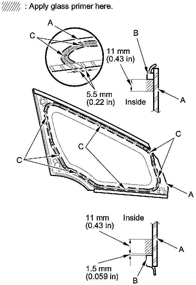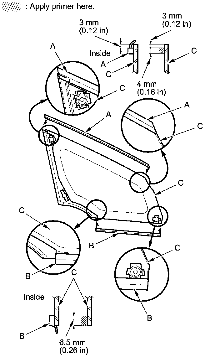 - Apply the glass primer to the front and rear portions of the front corner glass, using the printed dots (C) on the front corner glass as a guide.
