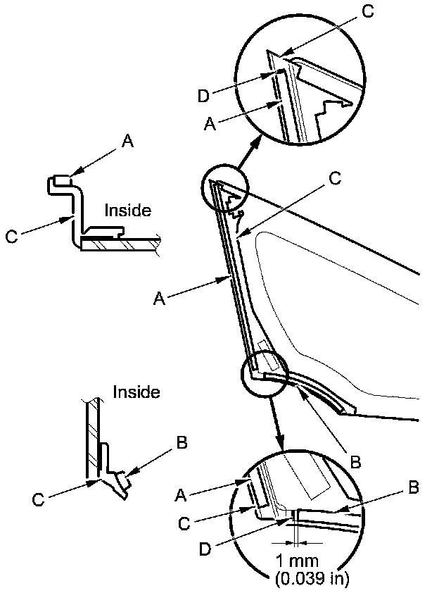 11. Attach seals A and B to the inside face of the quarter glass trim (C). Be sure the top edges of the seals line up with the alignment lines (D) on the trim as shown.