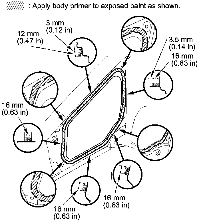 15. Apply a light coat of body primer to any exposed paint or metal around the front corner glass mounting flange. Let the body primer dry for at least 10 minutes:
