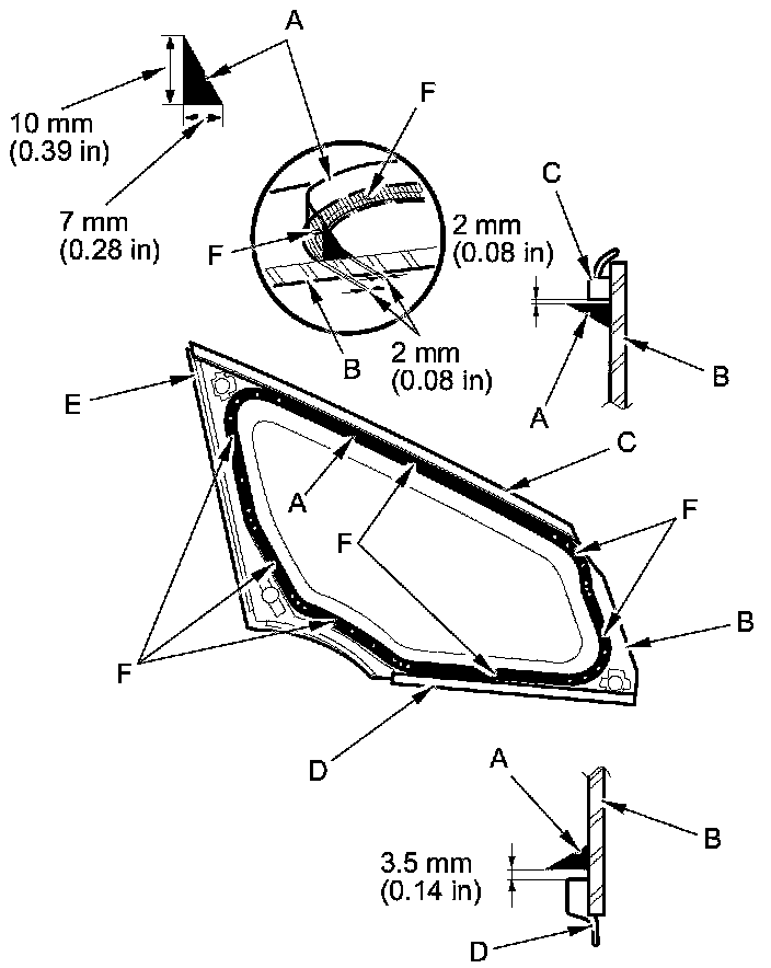 Apply the adhesive to the front and rear portions of the front corner glass, using the printed dots (F) on the front corner glass as a guide.