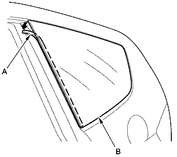 2. Remove the rubber dam (A) from the front edge of the quarter glass (B). If necessary, cut the rubber dam with a utility knife.