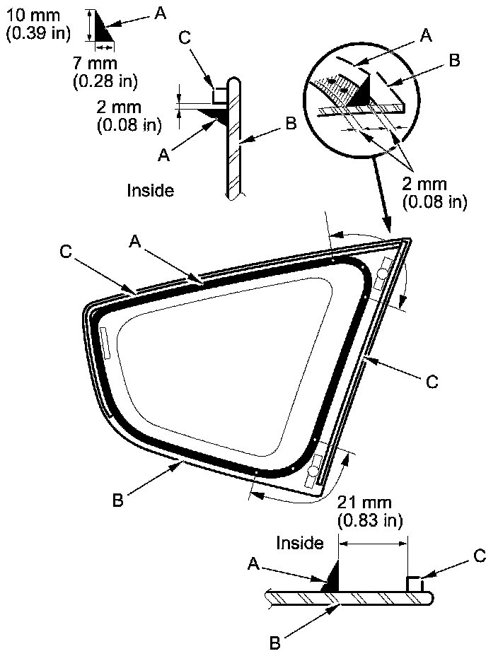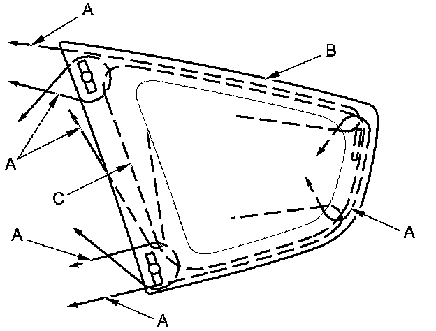 15. Put the cartridge in a caulking gun, and run a continuous bead of adhesive (A) around the edge of the quarter glass (B) and along the rubber dams (C) as shown. Apply the adhesive to the corner portions of the quarter glass, using the printed dots on the glass as a guide. Apply the adhesive within 30 minutes after applying the glass primer. Make a slightly thicker bead at each corner.