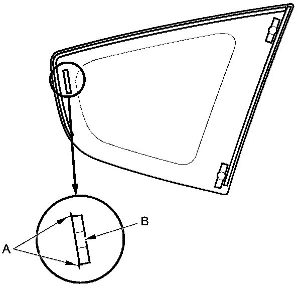 8. If you are reinstalling the old quarter glass, make alignment marks (A) along the edge of the old rear clip (B) as shown for installing the new rear clip.