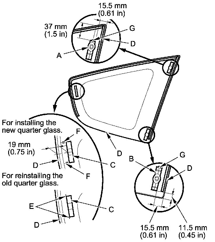 - If you are reinstalling the old quarter glass, align clip C with the alignment marks (E) you made in step 8.
