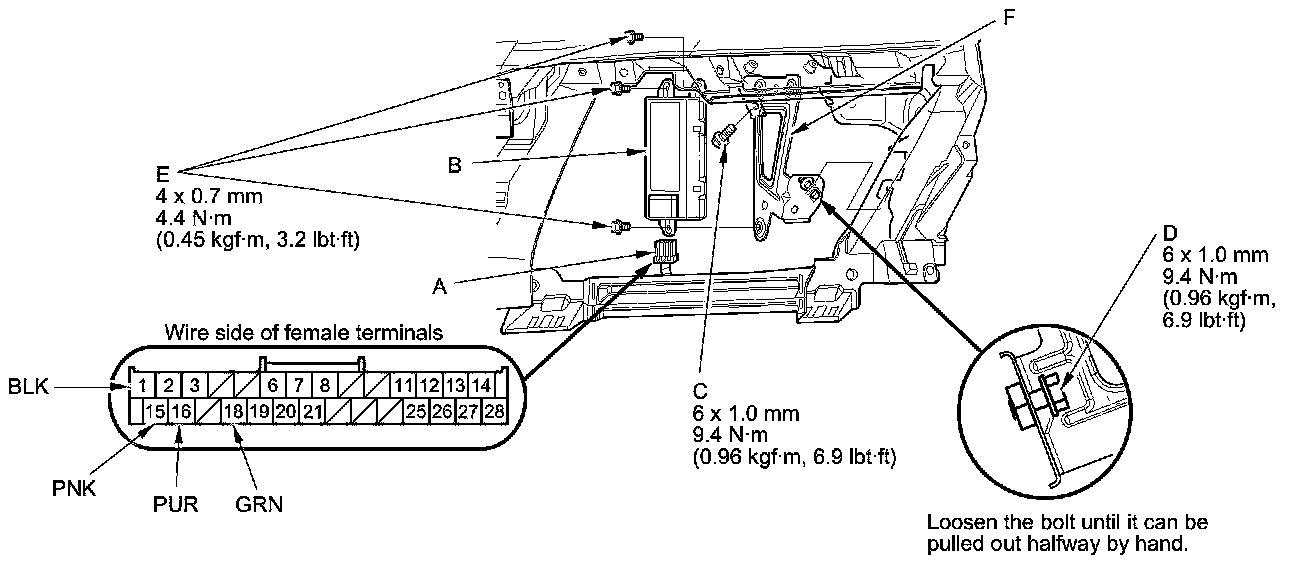 4. Remove the mounting bolt (C) and loosen the bolt (D), then remove the bolts (E) and HandsFreeLink control unit from the bracket (F).
