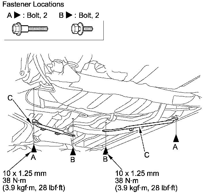 2. Remove the bolts (A, B) and the nuts ('11 model), then remove the trailing arm braces (C) from the body.
