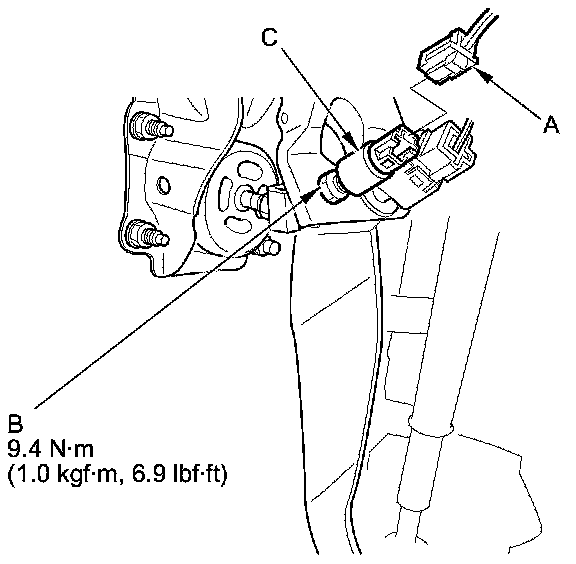 3. Loosen the locknut (B), and remove the idle stop switch (C).