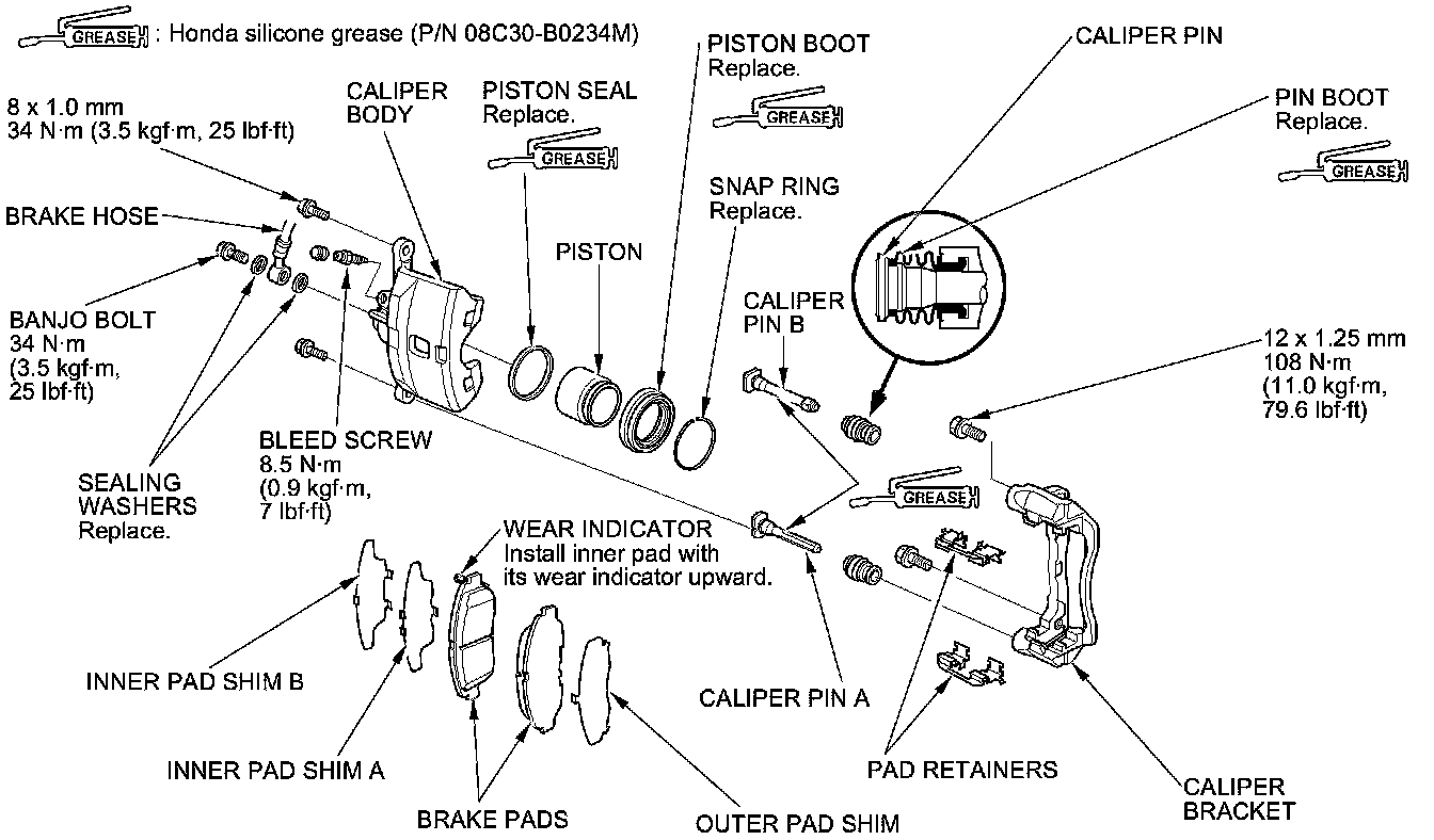 Remove, disassemble, inspect, reassemble, and install the caliper, and note these items: