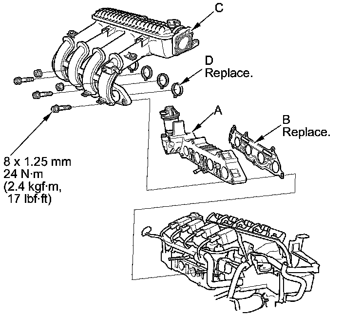 3. Install the intake manifold (C) with new gaskets (D), and tighten the bolts/nuts in a crisscross pattern in three steps, beginning with the inner bolt.