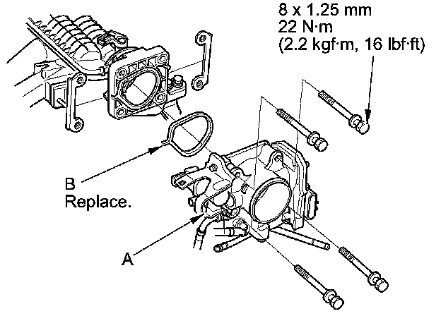 4. Loosen the intake manifold bracket mounting bolt (A). Tighten the mounting bolts (B), then tighten the mounting bolt (A).