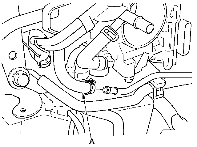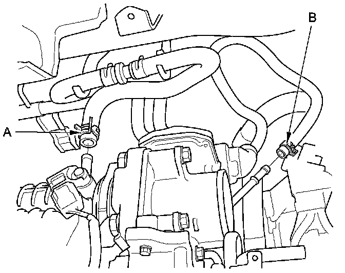 4. Remove the brake booster vacuum hose (A) and the EVAP canister hose (B).