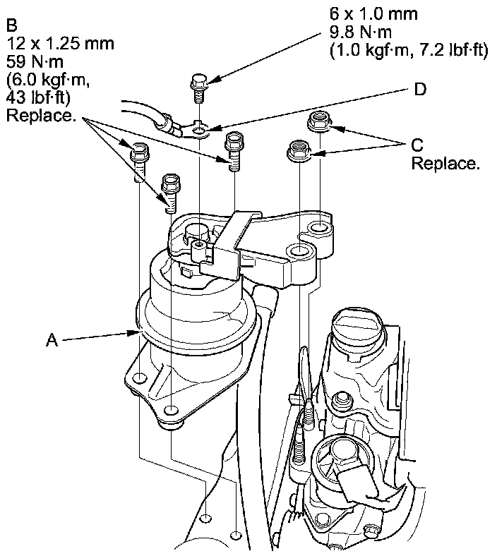 17. Install the side engine mount/bracket assembly (A), then tighten the new side engine mount/bracket assembly mounting bolts (B).