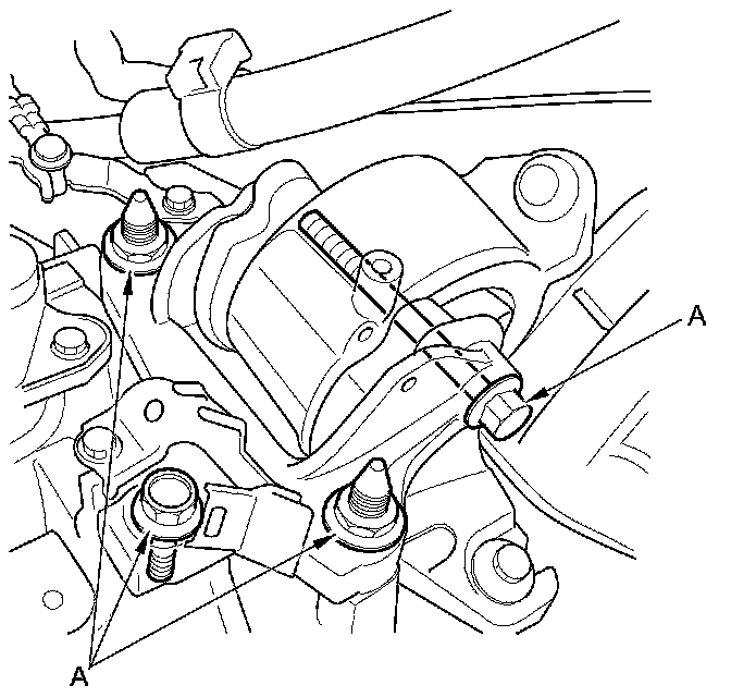 22. Loosen the transmission mount bracket mounting bolts and nuts (A).