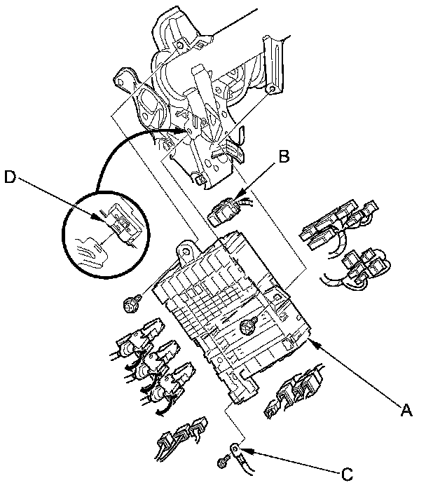 6. Release the lock (D), and pull the under-dash fuse/relay box away from the body.
