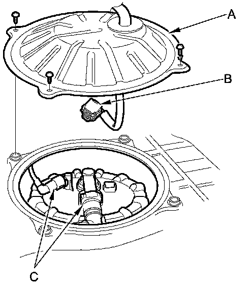 5. Disconnect the quick-connect fittings (C) from the fuel tank unit.