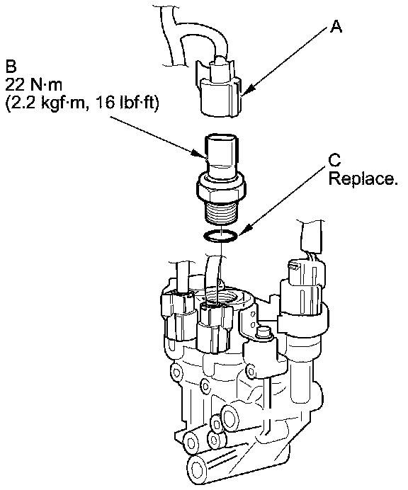 4. Install rocker arm oil pressure sensor B in the reverse order of removal with a new O-ring (C).