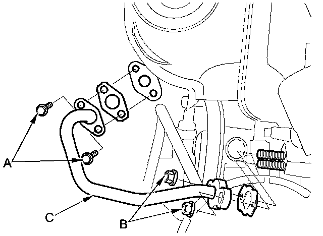 2. Install the EGR pipe to the TWC side, tighten the bolts (C) by hand with a new gasket (D), then torque the bolts.