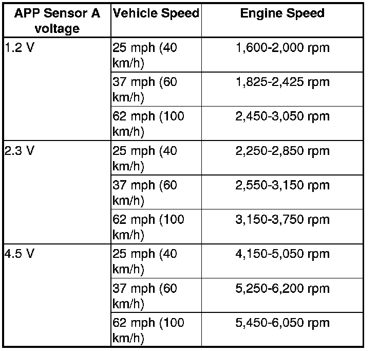 16. Review each snapshot individually, and compare APP Sensor A Voltage, Vehicle Speed, and Engine Speed to the following table: