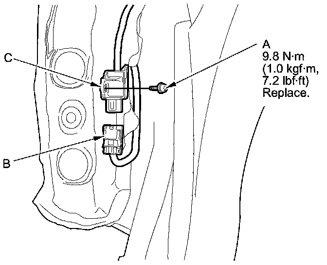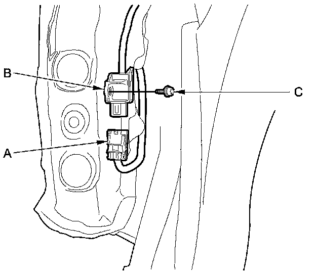 1. Install the front impact sensor with a new TORX bolt (A), using a TORX T30 bit. Connect the engine compartment wire harness 2P connector (B) to the front impact sensor (C).