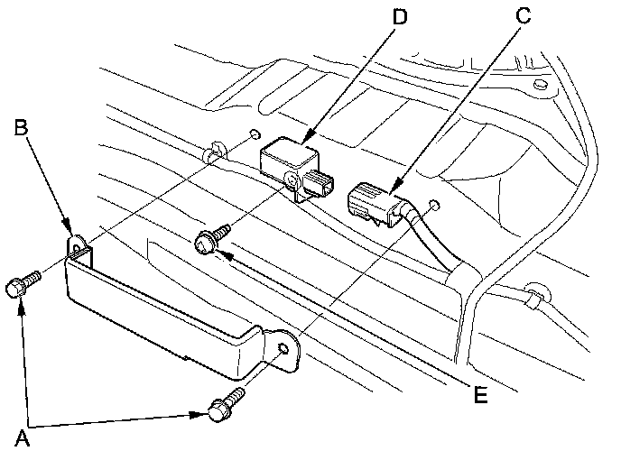 5. Disconnect the floor wire harness 2P connector (C) from the rear safing sensor (D). Remove the TORX bolt (E) using a TORX T30 bit, then remove the rear safing sensor.