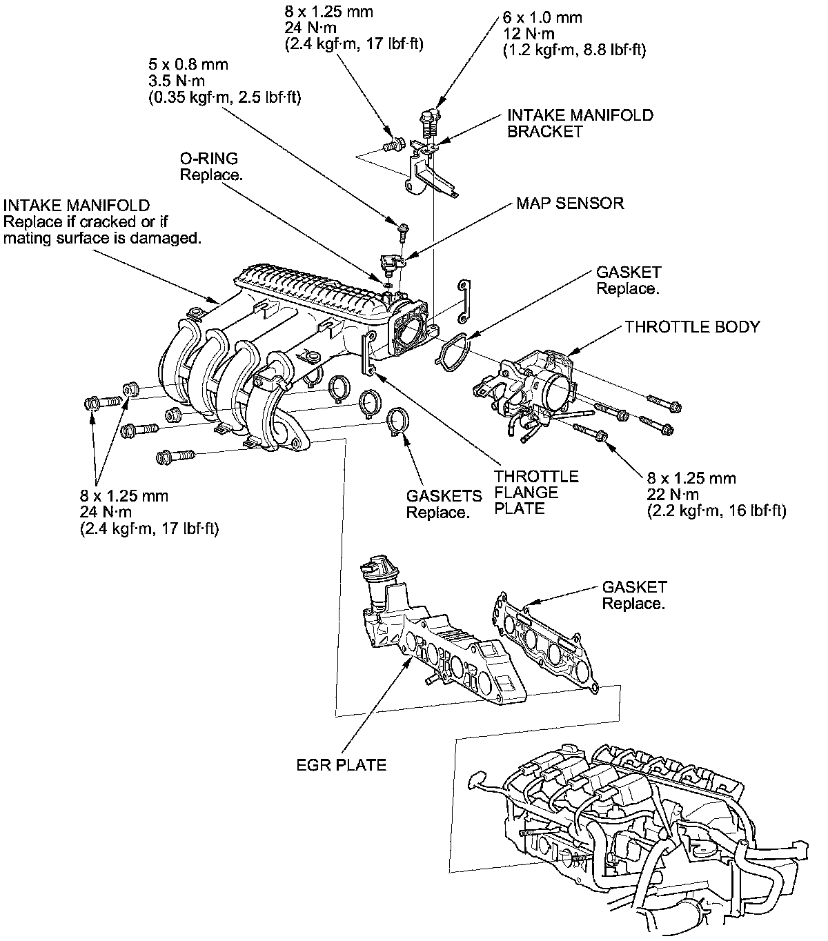 Tighten the manifold bolts/nuts in a crisscross pattern in three steps, beginning with the inner bolt.