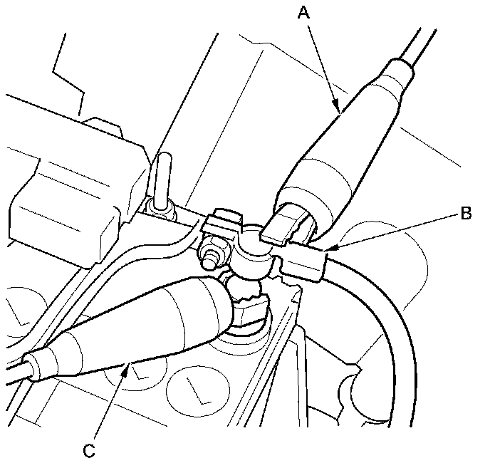 14. With the red (+) test lead (A) attached, slide the negative terminal (B) of the battery ground cable upwards from the battery negative terminal post to avoid misconnection. Then connect the black (-) test lead (C) to the battery negative terminal post.
