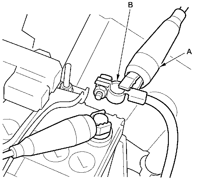 15. With the red (+) test lead (A) still attached, completely disconnect the negative terminal (B) of the battery ground cable from the battery negative terminal.