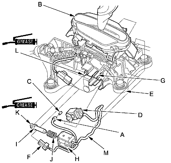 6. Replace the shift lock solenoid, solenoid plunger (I), and plunger spring (J) assembly.