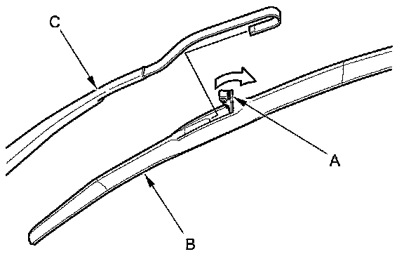 1. Gently pry up the lock (A) of the wiper blade assembly (B), and remove the wiper blade assembly from the wiper arm (C).