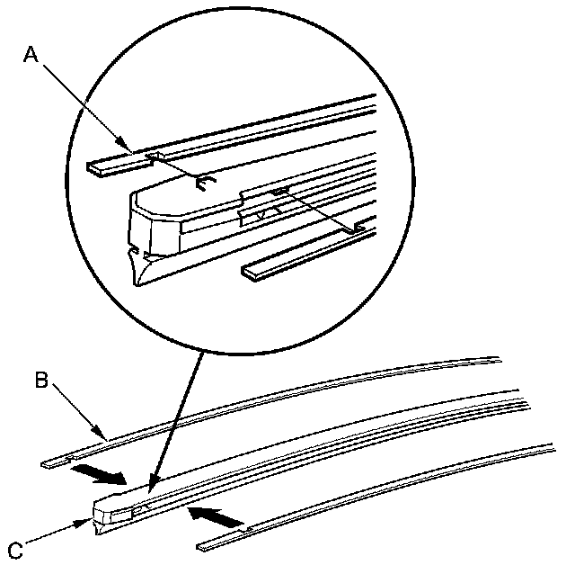 3. Align the groove (A) of each rail (B) with the tabs in a new wiper blade (C), then install the wiper blade and the rails into the blade holder in the reverse order of removal.